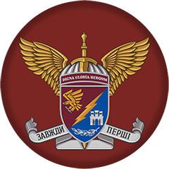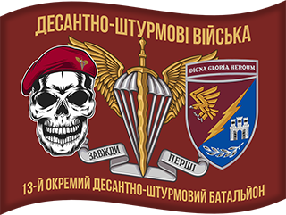 - Парашут із золотими крилами та мечем — традиційна емблема десанту, що підкреслює мобільність, блискавичну атаку та бойову перевагу. Девіз «Завжди перші» — кредо 13 ОДШБ, що підтверджується їхніми діями на полі бою.
