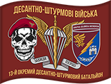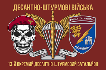 Прапор 13-го окремого десантно-штурмового батальйону Збройних Сил України — це унікальна візуальна емблема, яка відображає непохитний характер елітного підрозділу ДШВ. Цей дизайн поєднує традиційні десантні символи з новою візуальною мовою сили та смертоносної рішучості, що притаманна сучасному українському воїну.