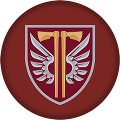 Справа — унікальний герб бригади: на щиті зображено два перехрещені золоті топірці на фоні срібних крил — символи сили, рішучості та мобільності десанту.