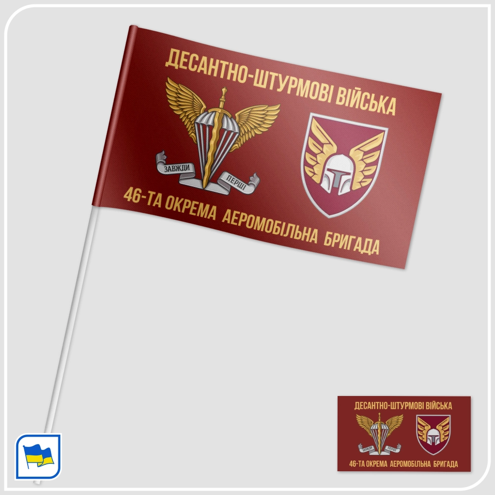Прапор 46-ї окремої аеромобільної бригади з великим номером бригади "46". - Фон прапора — темно-бордовий колір, традиційний для Десантно-штурмових військ ЗСУ.- Велике біле число "46" — номер бригади, займає центральну частину прапора, виділяється контрастом із фоном.- Центральна емблема — стилізоване зображення парашута з розкрити..