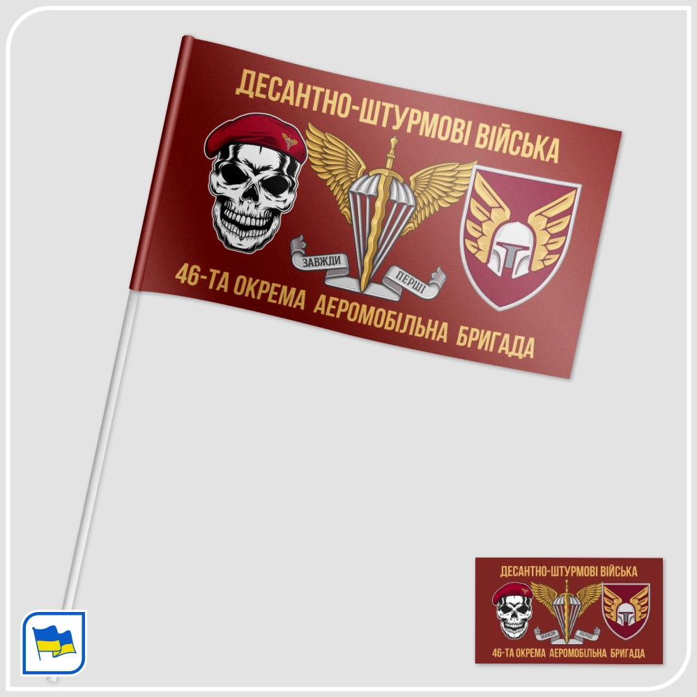 Прапор 46-ї окремої аеромобільної бригади з бойовим символом — черепом у береті. Цей варіант прапора 46 ОАеМБр — візуальна маніфестація бойового духу, зухвалості та незламної волі українських десантників. Прапор виконаний у фірмовому бордовому кольорі Десантно-штурмових військ ЗСУ, символізуючи кров, пролиту за свободу України, і непохи..